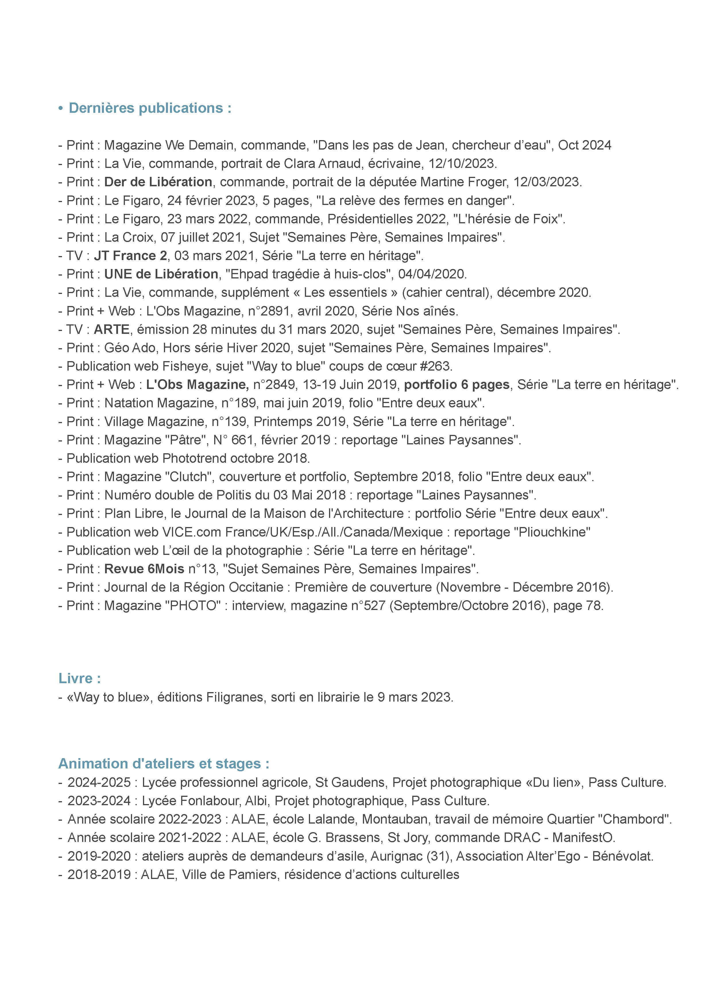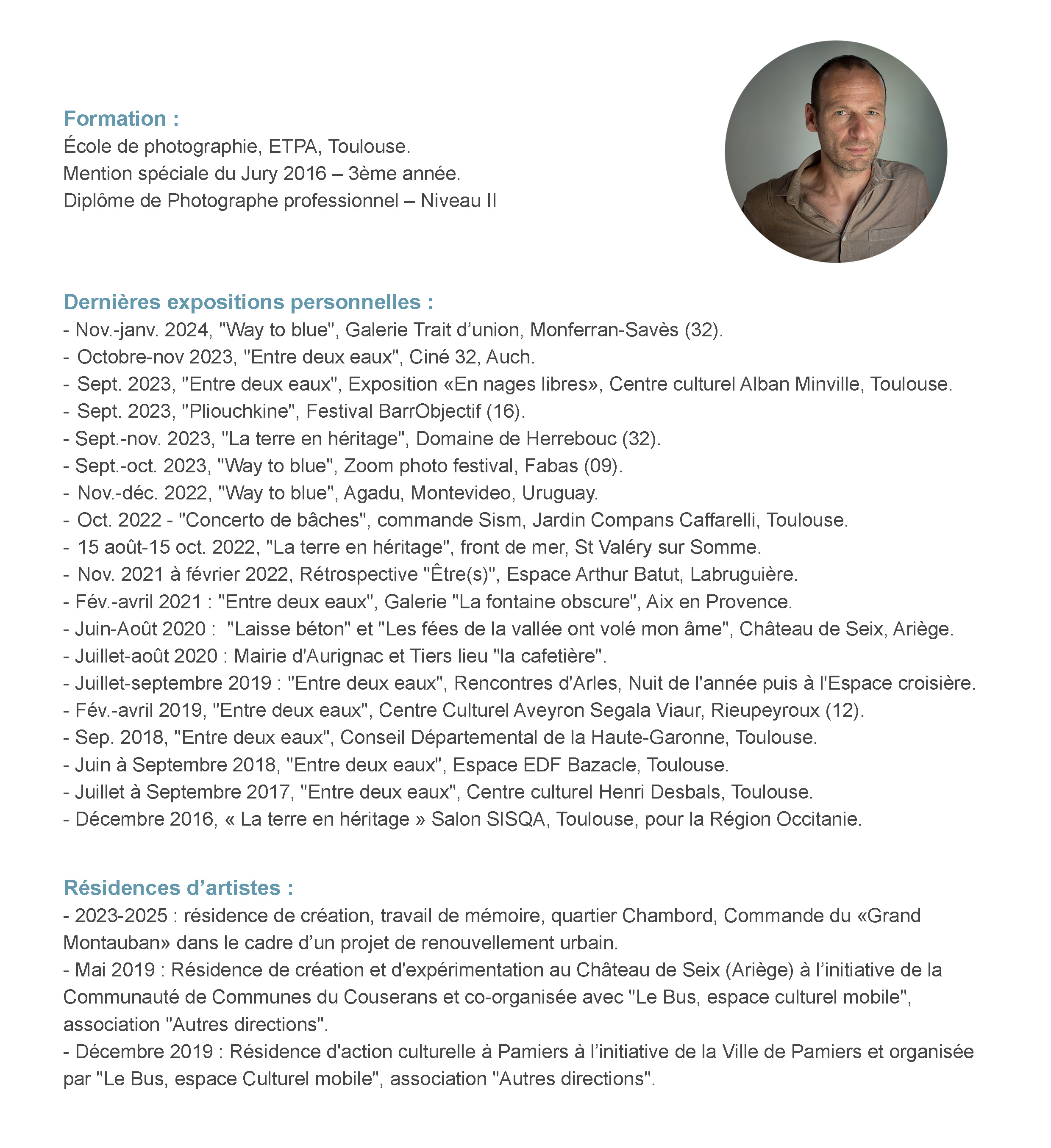 En 2014, je décide, à 41 ans, de suspendre mon activité salariée pour m’inscrire à l’école de photographie de Toulouse (ETPA). J’en sors diplômé en 2016 avec la mention spéciale du jury. Mes travaux personnels sont généralement construits sur le long cours. J’alterne mon activité entre résidences d’artistes, expositions personnelles, commandes, ateliers et recherches photographiques. L’exposition constitue pour moi un vecteur primordial permettant la rencontre de mes sujets au public, l’échange et la confrontation des points de vue. J’ajoute aujourd’hui d’autres écritures à ma photographie comme le reportage sonore et j’élargis le champ d’action de mes sujets et de leurs formes grâce à diverses collaborations artistiques. Membre de l’agence Hans Lucas depuis 2019, mes sujets sont régulièrement publiés dans la presse. Mon premier livre photographique, « Way to blue », est sorti en Mars 2023 porté par les éditions Filigranes.