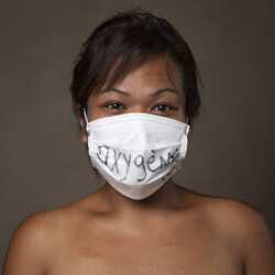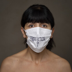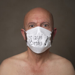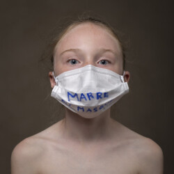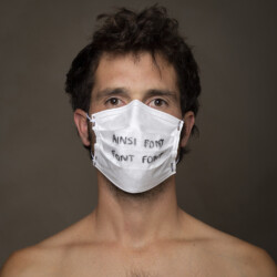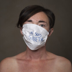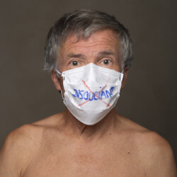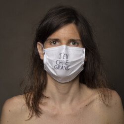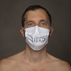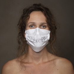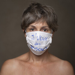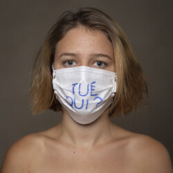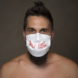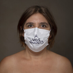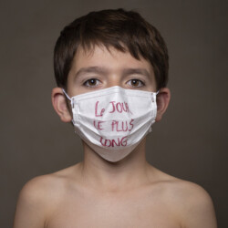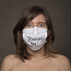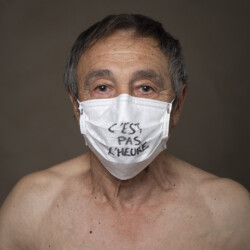 Mais l’intérêt de cette série réside aussi dans le protocole que met en place le photographe en intégrant un dispositif par lequel le modèle devient partie prenante de son portrait. Il demande à chacun d’intervenir en exprimant par un mot ou un dessin inscrit sur son masque ce que la situation lui inspire. Agissant à la manière des bulles de bande dessinée ou de sous-titre d’un film muet ils y déposent une parole que leurs bouches cousues, invisibles, ne peuvent articuler. Paroles empêchées et vécu par certains comme une forme de liberté bâillonnée.