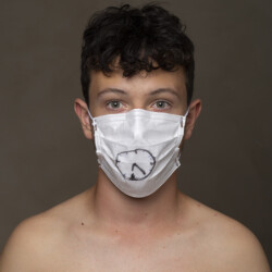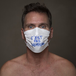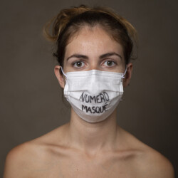 Les torses nus participent de cette sensation de fragilité face au virus et font de ces masques au centre de l’image des formes abstraites qui voilent les identités. Ils sont aussi le signe de l’étrange période de distanciation sociale que nous traversons puisque, jadis interdits dans l’espace public au nom de l’ordre républicain, ils sont devenus obligatoires en période de pandémie par respect de l’ordre sanitaire…