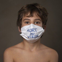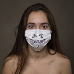 D’abord jugé inutile par nos autorités médicales et politiques pour cause de pénurie il devint une fois les approvisionnements progressivement assurés, conseillé, provoquant des queues devant les pharmacies, puis obligatoire pour rejoindre d’autres gestes barrières contre la contamination. Il prit des formes et des couleurs variées du bleu sainte vierge au noir en passant par le blanc sans oublier les tissus multicolores des masques artisanaux fabriqués par nos soins lors des longues journées d’inactivité. Répondant à des fonctions plus ou moins filtrantes, des ports plus ou moins fantaisistes, du bas des yeux, glissant sous le nez, ou pour les récalcitrants en position bavette. La police était là, attentive à faire respecter le double confinement, cloîtrés dans nos logis ou en cas de sorties dûment justifiées sous nos masques.