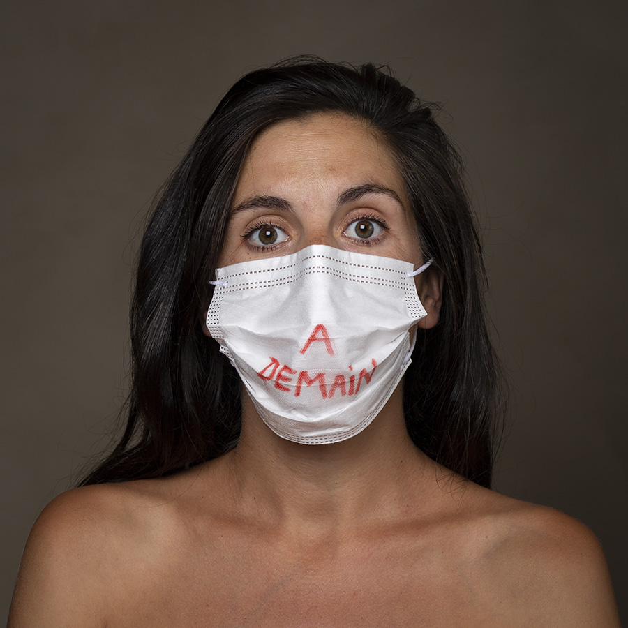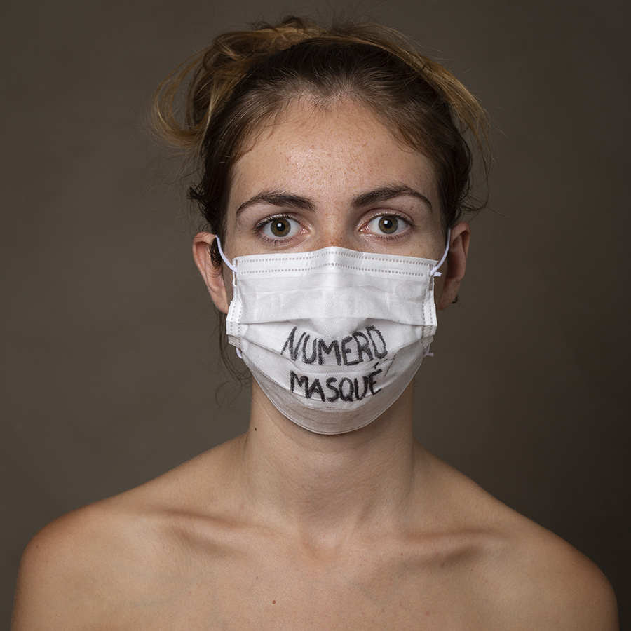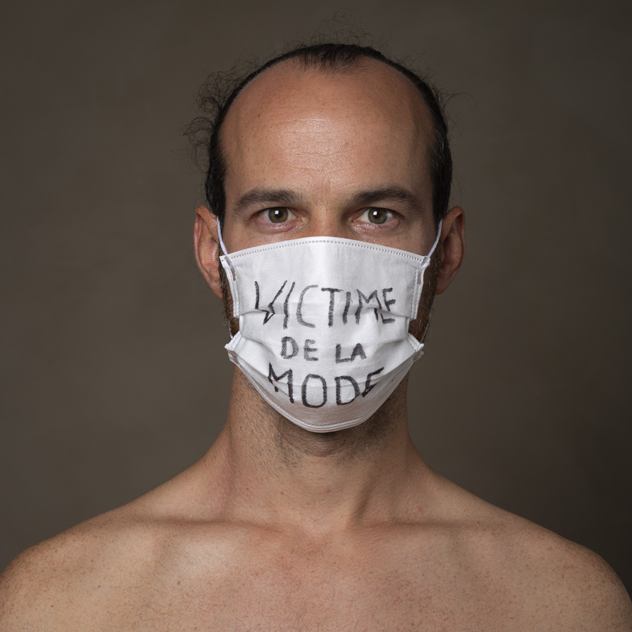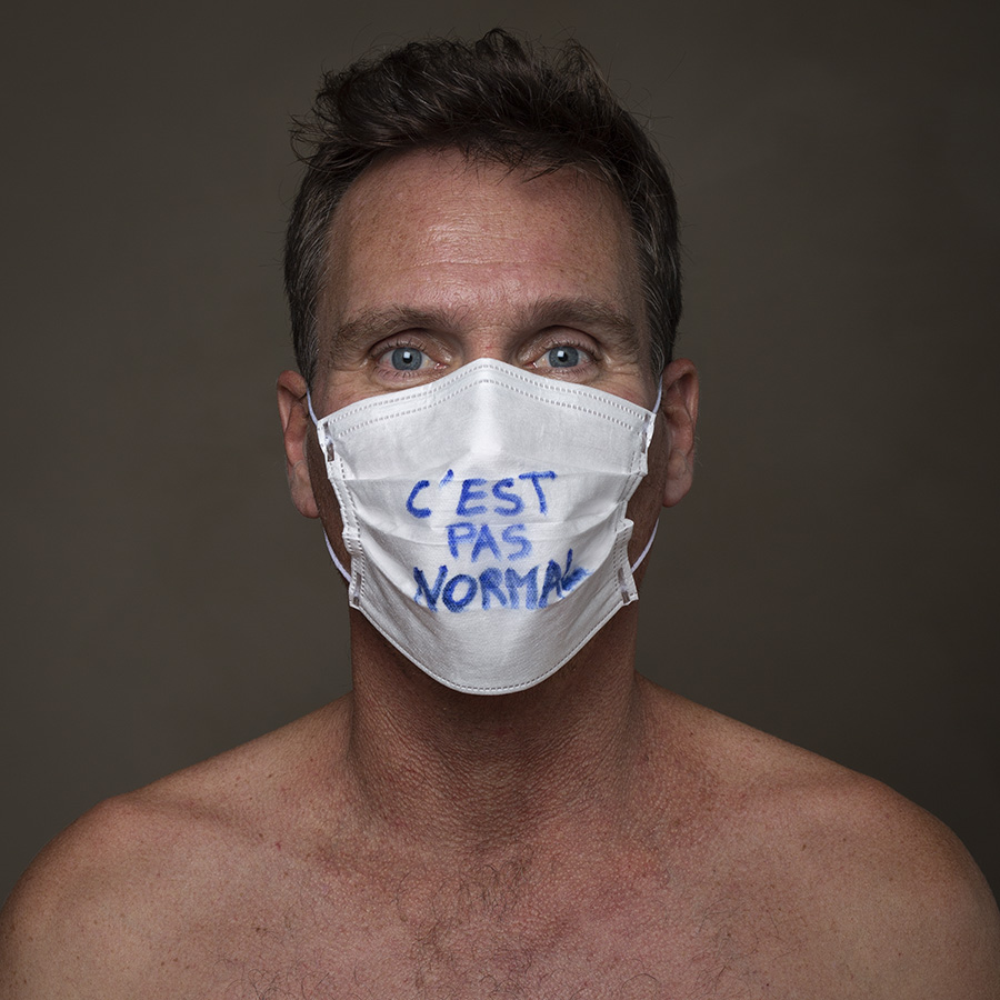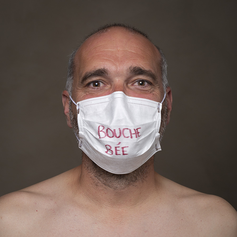 Mais l’intérêt de cette série réside aussi dans le protocole que met en place le photographe en intégrant un dispositif par lequel le modèle devient partie prenante de son portrait. Il demande à chacun d’intervenir en exprimant par un mot ou un dessin inscrit sur son masque ce que la situation lui inspire. Agissant à la manière des bulles de bande dessinée ou de sous-titre d’un film muet ils y déposent une parole que leurs bouches cousues, invisibles, ne peuvent articuler. Paroles empêchées et vécu par certains comme une forme de liberté bâillonnée.