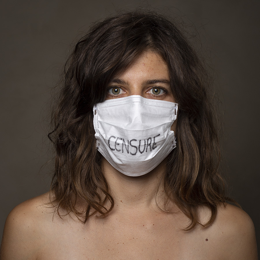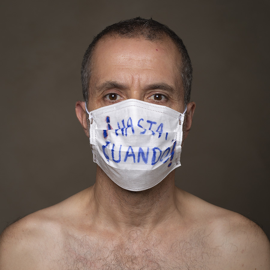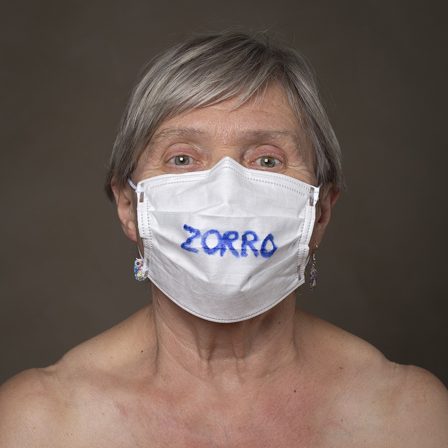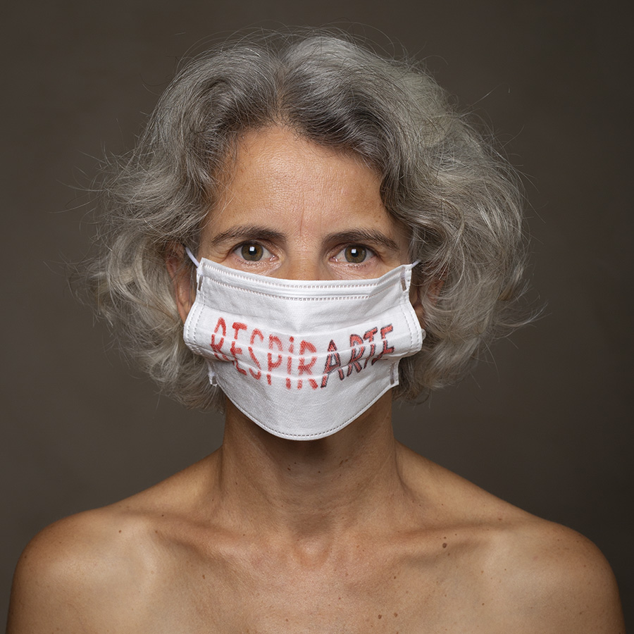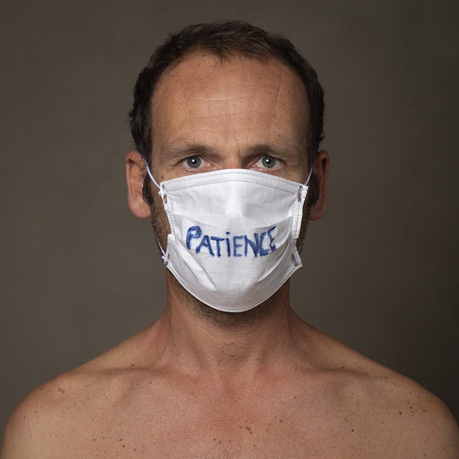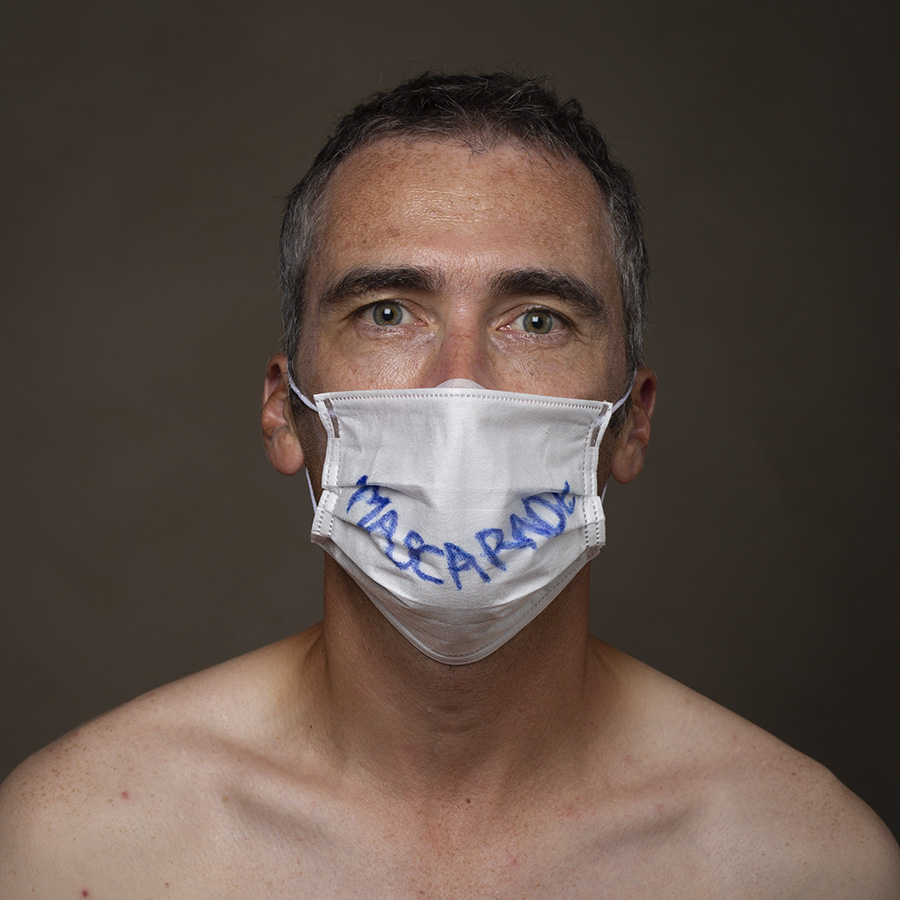 Mais l’intérêt de cette série réside aussi dans le protocole que met en place le photographe en intégrant un dispositif par lequel le modèle devient partie prenante de son portrait. Il demande à chacun d’intervenir en exprimant par un mot ou un dessin inscrit sur son masque ce que la situation lui inspire. Agissant à la manière des bulles de bande dessinée ou de sous-titre d’un film muet ils y déposent une parole que leurs bouches cousues, invisibles, ne peuvent articuler. Paroles empêchées et vécu par certains comme une forme de liberté bâillonnée.