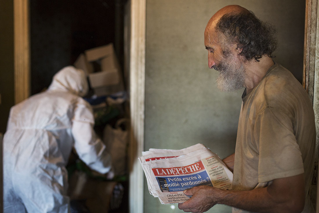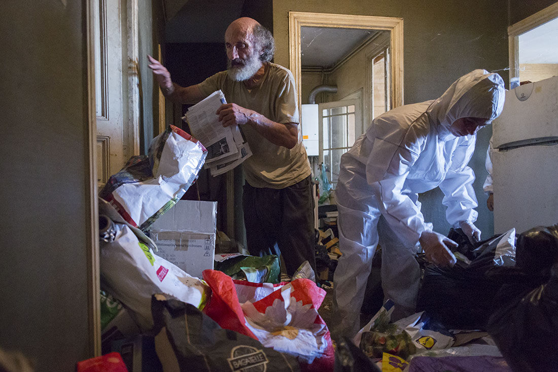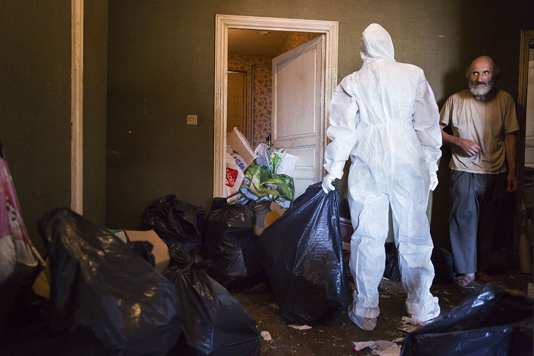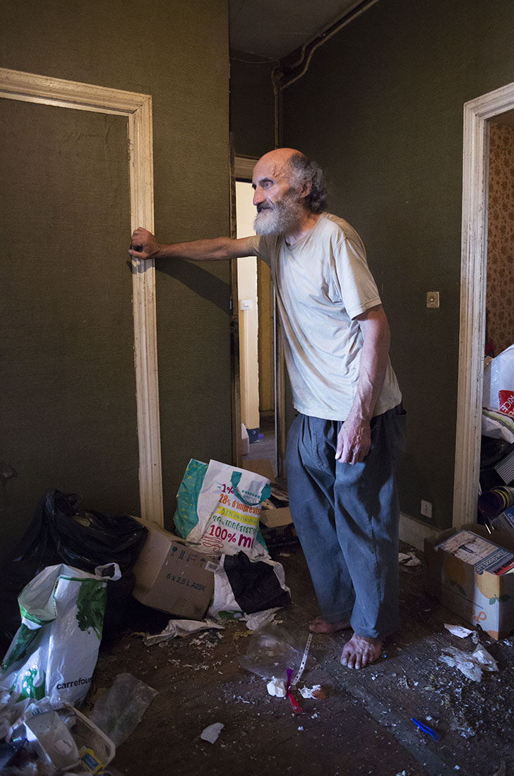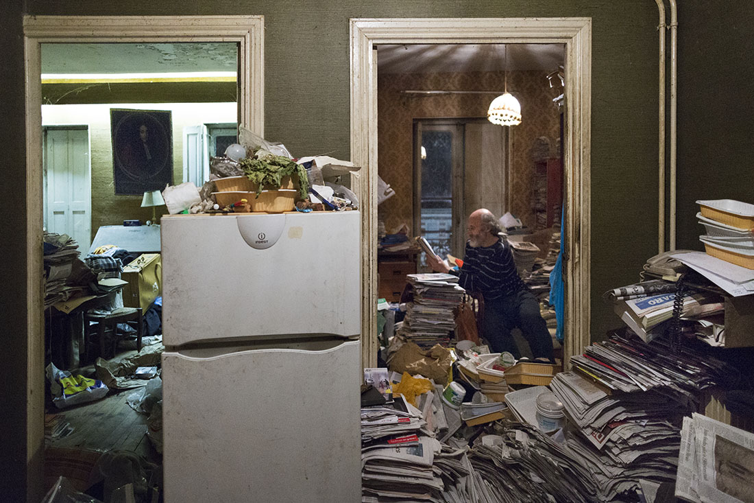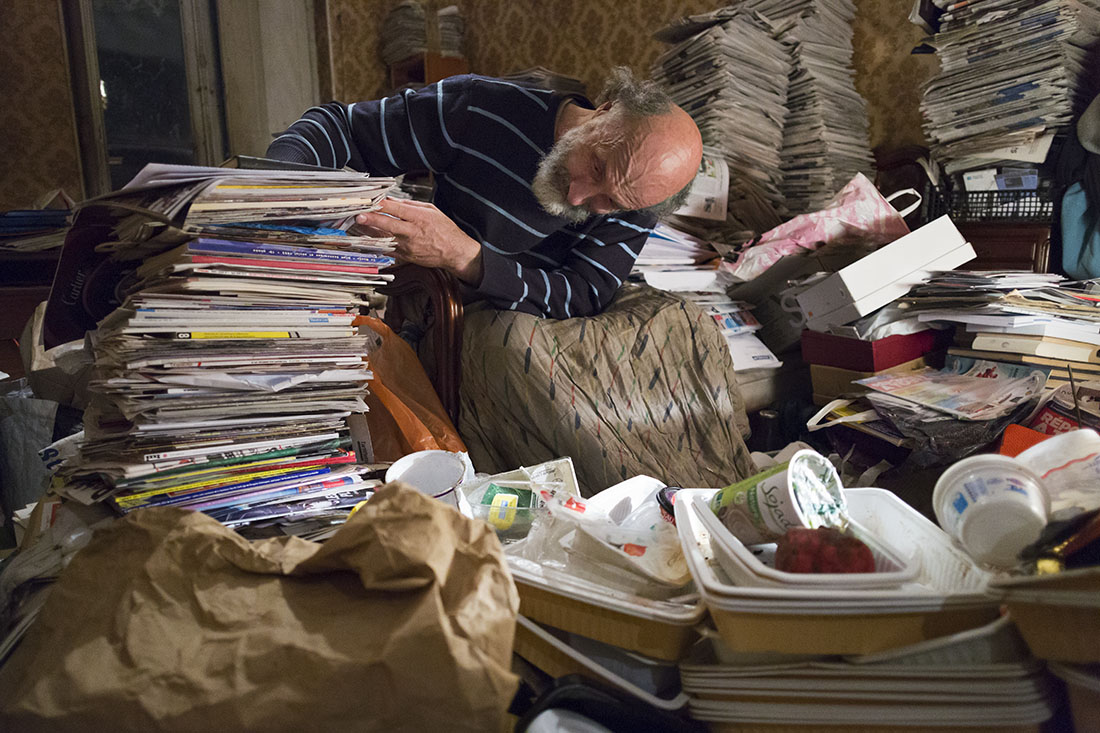 Pliouchkine syndrome, better known as “Diogenes syndrome or “compulsive accumulation”, is a inhomogeneous and complex disorder. The activity of accumulation, social withdrawal and the refusal of help are the main symptoms. Jean roams through town every night at the same time, following the same paths in search of what interests him the most; food to feed himself, books and newspapers to satisfy his need for knowledge. He also accumulates, in an excessive form, all sorts of objects, independently of their use and value. His lifestyle is original but not insane. He follows his own logic. Thus, in respect for the environment, he dries the food he collects in the bins, to reduce the volume and improve the waste incinerator’s productivity. Roughly once a year, for sanitary reasons, the town services make a cleaning society intervene. Jean therefore attempts to put aside all of his most valued findings. However, during the two day intervention, the entirety of the objects covering his apartment floor will again return to household waste. Furthermore, as soon as the next day arrives, Jean returns to towns with the same aims in mind, bringing baskets of food up to his apartment, newspapers and other unusual objects. *Pliouchkine is a character from Nikolaï’s novel, “Les ames mortes”. A Russian aristocrat, living in an impressively disorderly house, he crosses regions in search of all sorts of jumbles and accumulates his findings in his house.