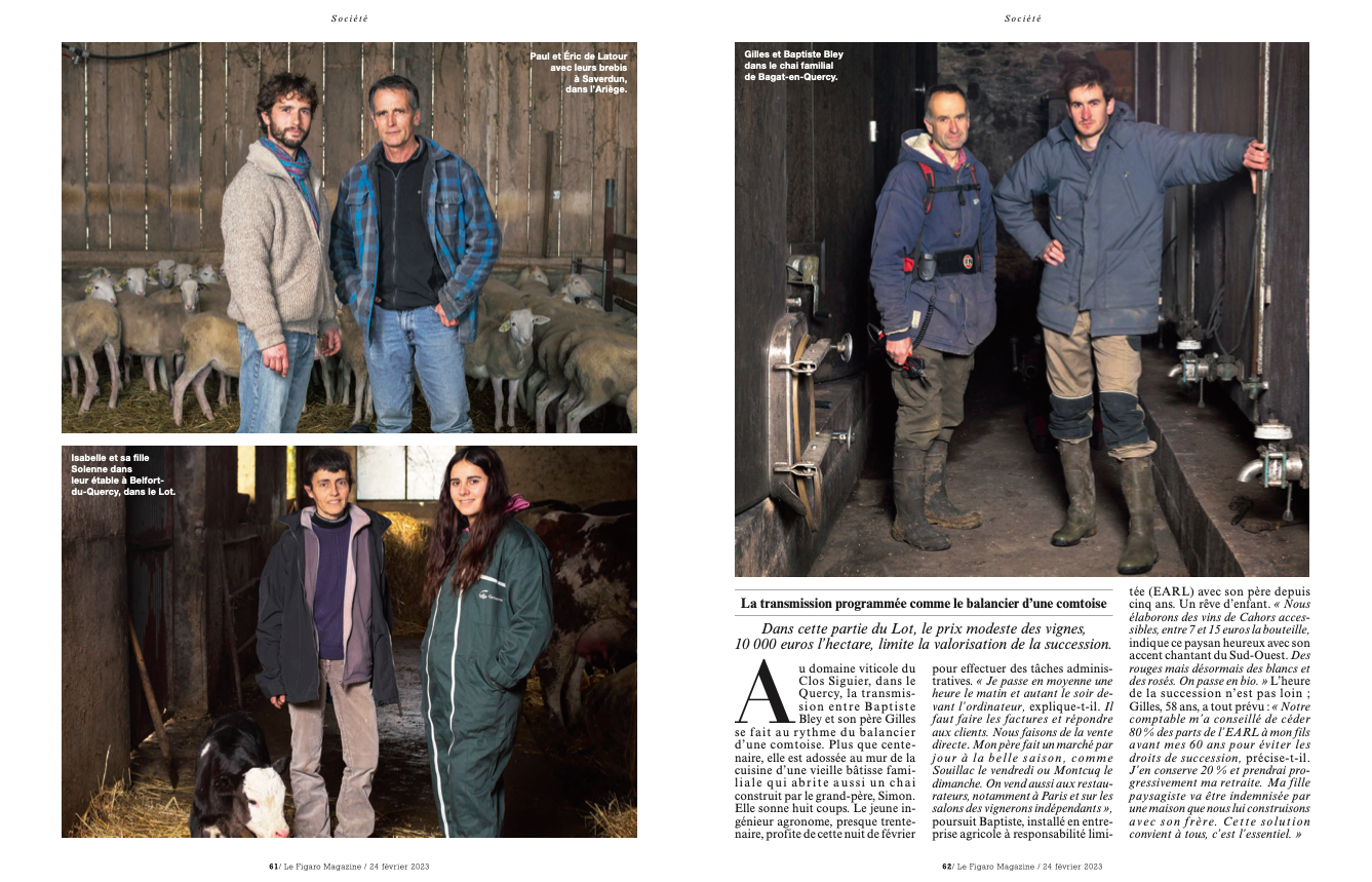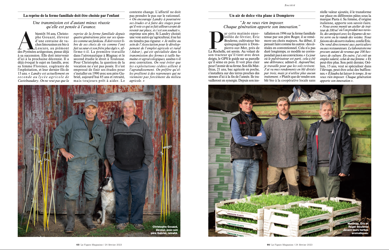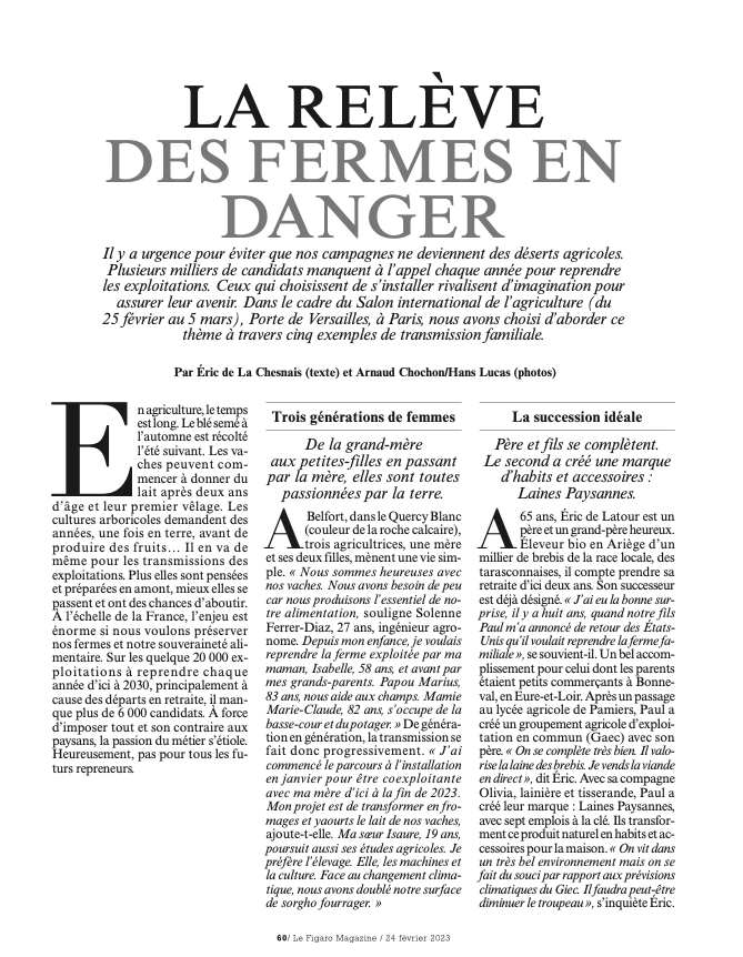 Actuellement en presse, 5 pages dans Le Figaro Magazine du 24 février sur un sujet qui m’est cher : “La relève des fermes en danger”.